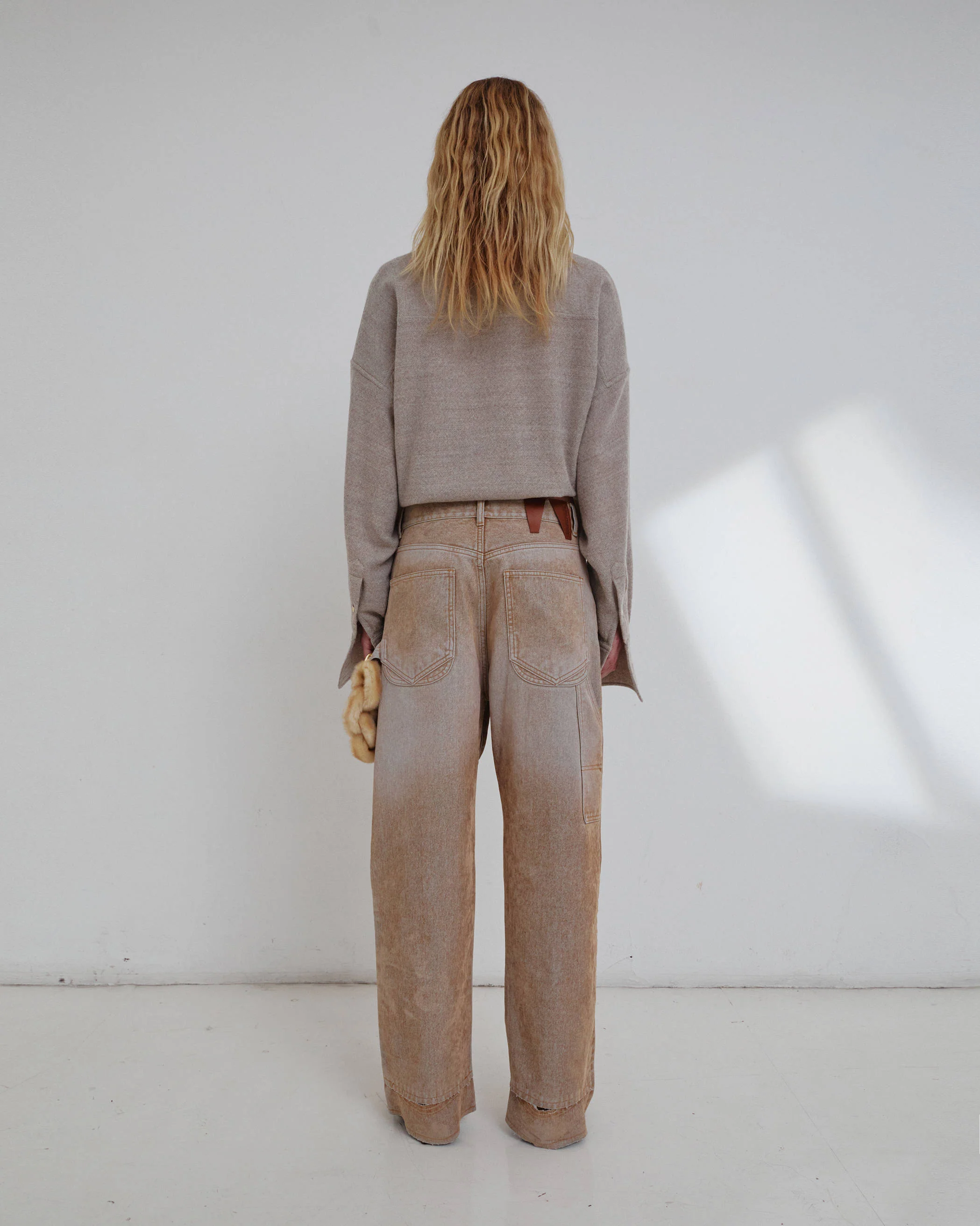 LISA faux fur chain adorned carpenter denim in beige.