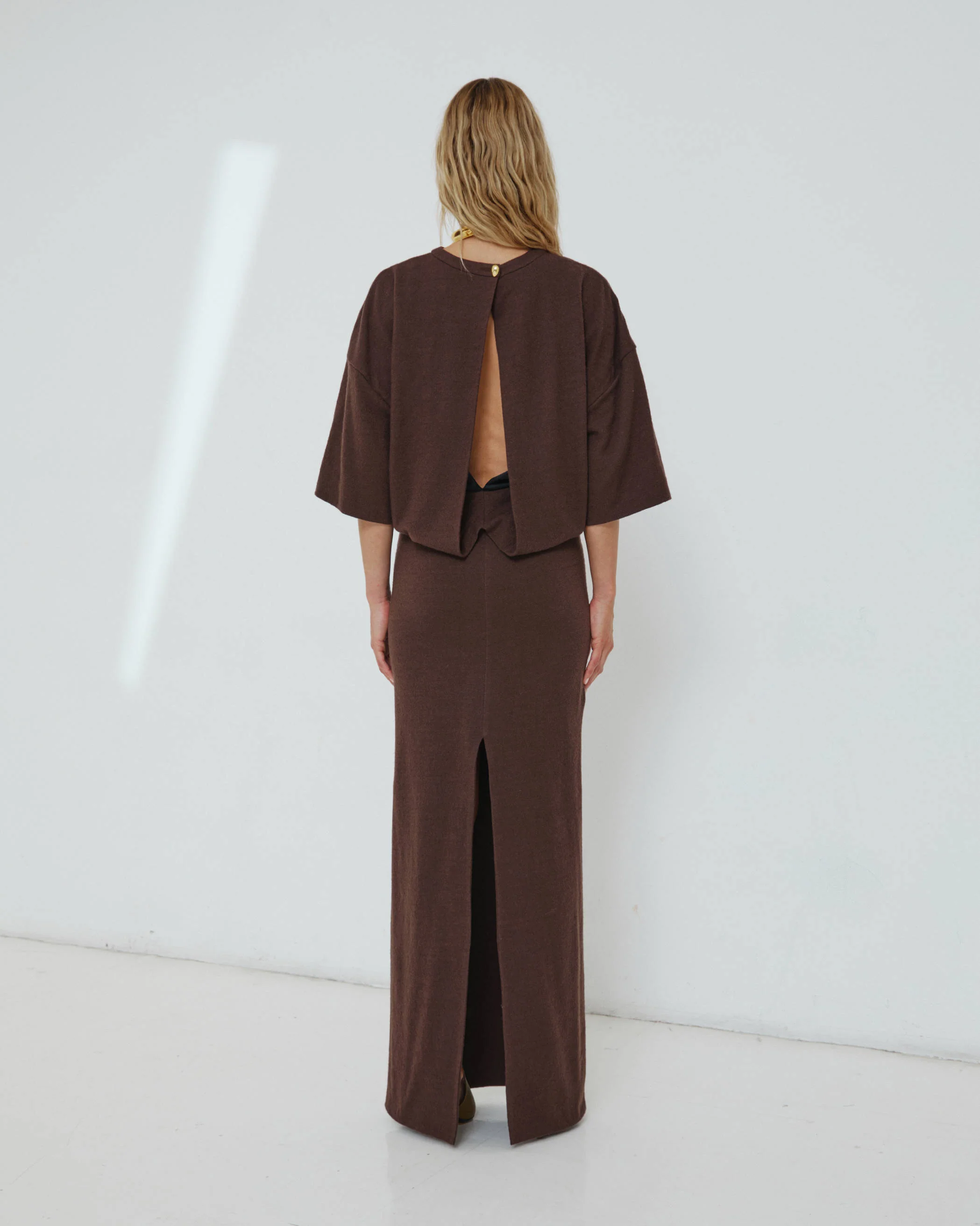 MARLIN open back wool dress in dark brown.