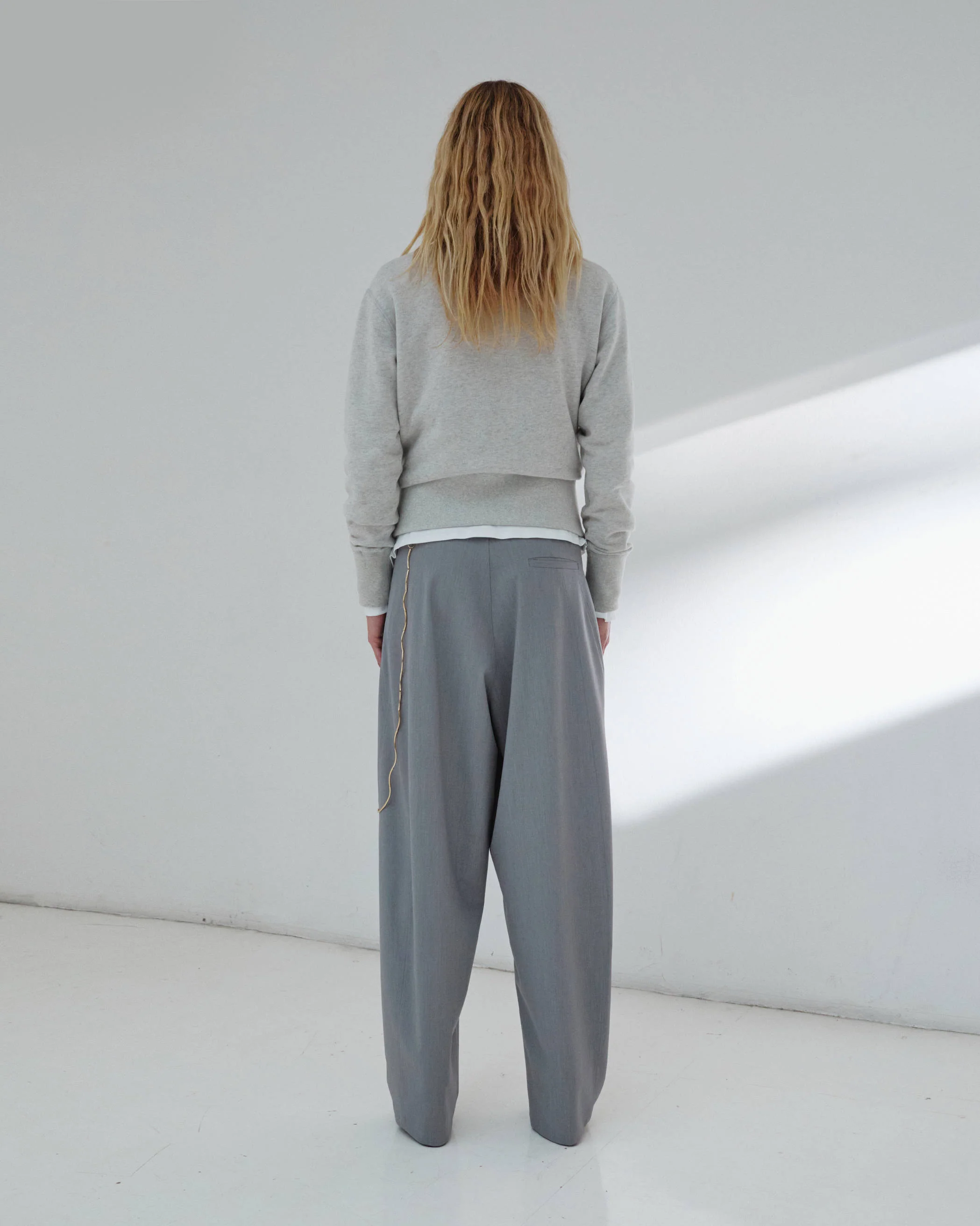 PHEBE chain-adorned wide-leg pants in light grey.
